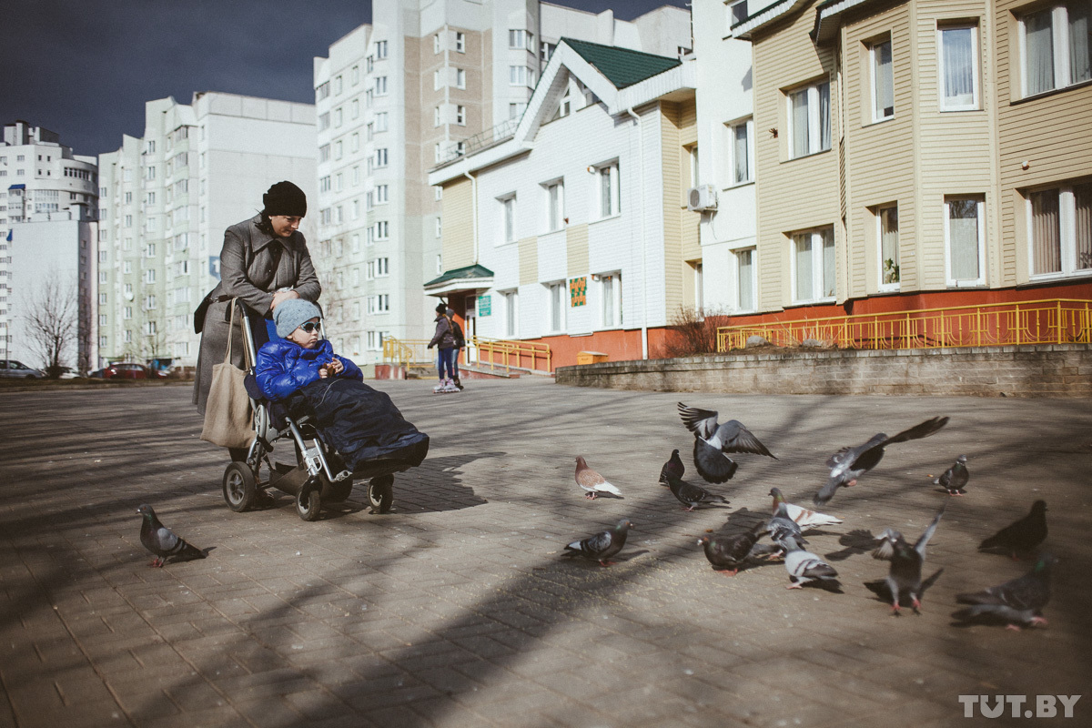 Анна Герина на прогулке с Яной. Из письма Анны Гериной: «Ну, не съездит моя Яна никогда на море, не сможет посидеть на песочке, окунув ноги в воду. Не увидит она Диснейленда и не побывает в обществе, где не тычут пальцем вслед и не задают дурацких вопросов: „А почему такая большая и не ходишь?!“ (а такое было, правда, когда мужчина узнал, в чем причина, он покраснел и купил Яне шарик. — Прим. автора). Не почувствует свою принадлежность к обществу, где рядом тоже колясочники и это нормально. А я, ее мама, буду и дальше слушать ее фразы (которые звучат все реже и реже): „Почему мы не можем покататься на карусели? Мама, а где все инвалиды? Мама, а зачем мне этот дурацкий массаж, он ведь меня не вылечит? Мама, я не люблю Беларусь… Почему? Потому что здесь не любят инвалидов. Я ведь — инвалид?!“. Да Янка… инвалид…»